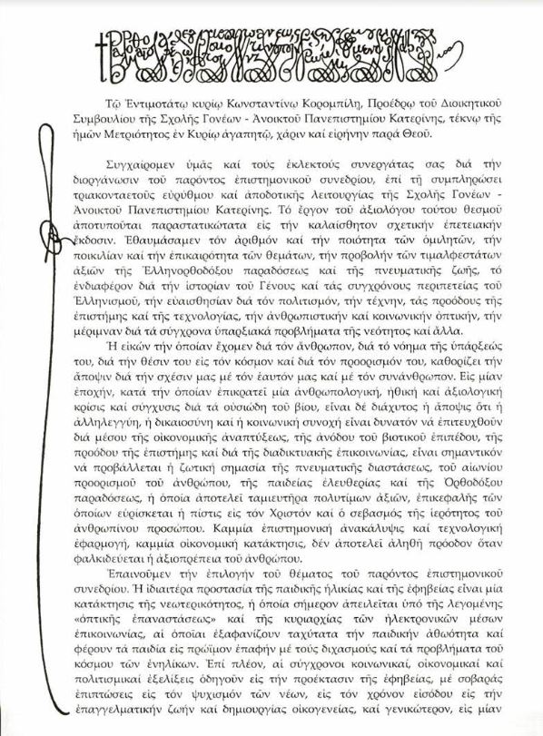 Χαιρετισμό απέστειλε ο Οικουμενικός Πατριάρχης κ.κ. Βαρθολομαίος με αφορμή την έναρξη του Διήμερου Επιστημονικού Συνεδρίου της Σχολής Γονέων Κατερίνης. Μεταξύ άλλων ο Οικουμενικός Πατριάρχης αναφέρει: “η ιδιαίτερη προστασία της παιδικής ηλικίας και της εφηβείας είναι μια κατάσταση της νεωτερικότητος η οποία σήμερα απειλείται υπό της λεγόμενης “οπτικής επαναστάσεως” και της κυριαρχίας των ηλεκτρονικών μέσων επικοινωνίας”.