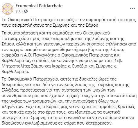 Το Οικουμενικό Πατριαρχείο, αυτές τις δύσκολες ώρες της δοκιμασίας για τους δύο γειτονικούς λαούς της Τουρκίας και της Ελλάδας, προσεύχεται για την ανάπαυση των ψυχών των συνανθρώπων μας που έχασαν τη ζωή τους, για την αποκατάσταση της υγείας των τραυματιών και την ανακούφιση όλων των πληγέντων. Εύχεται, ο Κύριός μας να ενισχύει τις αρμόδιες Κρατικές και τοπικές αρχές στο έργο τους, και ιδιαιτέρως τα σωστικά συνεργεία στη Σμύρνη, τα οποία αγωνίζονται να εντοπίσουν και να διασώσουν εγκλωβισμένους σε κτίρια που κατέρρευσαν.