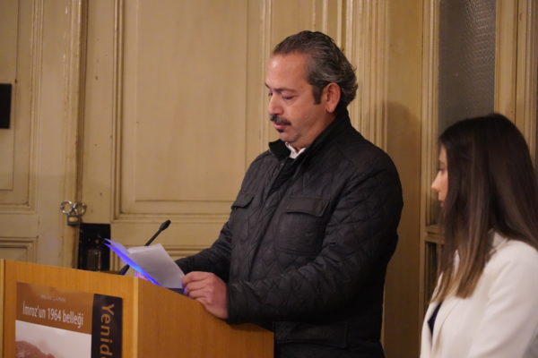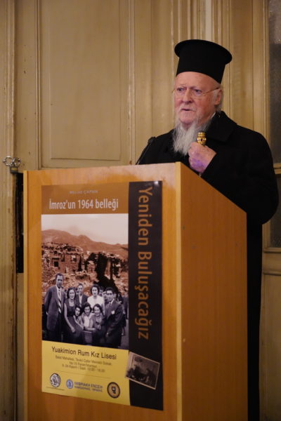 Ο Παναγιώτατος, σε σύντομο χαιρετισμό του, εμφανώς συγκινημένος, συνεχάρη τη δημιουργό της Εκθέσεως για την πρωτοβουλία της, και αναφέρθηκε στη δύσκολη εκείνη περίοδο και στην αδικία που συντελέστηκε σε βάρος των Ιμβρίων, με την εφαρμογή του «Προγράμματος διάλυσης», εξέφρασε δε την λύπη του για τις διακρίσεις που έγιναν γενικότερα σε βάρος των Ρωμηών κατά το παρελθόν, και διερωτήθηκε για ποιο λόγο η Θεολογική Σχολή της Χάλκης παραμένει μέχρι σήμερα κλειστή. Καταλήγοντας, επεσήμανε ότι τα τελευταία χρόνια έχουν γίνει βήματα για την αποκατάσταση αδικιών του παρελθόντος και ευχαρίστησε γι’αυτό την Κυβέρνηση και τις αρχές της χώρας.