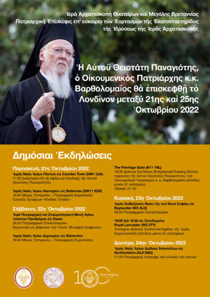 Αρχικά αύριο στον Ιερό Ναό Αγίων Πάντων Camden Town θα τελεστεί δοξολογία με αφορμή την άφιξη και την υποδοχή του Οικουμενικού Πατριάρχη. Το απόγευμα της ίδια ημέρα ο Παναγιώτατος θα χοροστατήσει στον Μεγάλο Εσπερινό που θα τελεστεί στον Ιερό Ναό του Αγίου Νεκταρίου στη Battersea.