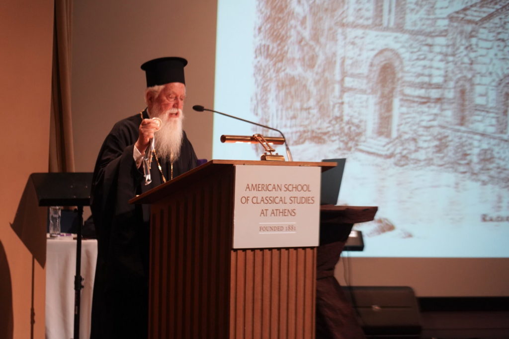 Αμέσως μετά, στον αυλόγυρο της Αμερικανικής Σχολής Κλασικών Σπουδών, όπου πραγματοποιήθηκε η εκδήλωση, παρετέθη δεξίωση, κατά την οποία ο Παναγιώτατος είχε ολιγόλεπτη εγκάρδια κατ’ ίδιαν συζήτηση με τον Εξοχ. Πρόεδρο της Ελληνικής Δημοκρατίας.
