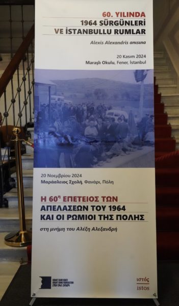 Ιδιαίτερες ευχαριστίες εξέφρασε προς τον δημοσιογράφο και συγγραφέα κ. Rıdvan Akar ο οποίος έκανε γνωστό το ζήτημα των απελάσεων του ’64 στο ευρύτερο κοινό της Τουρκίας μέ το βιβλίο του «20 δολάρια, 20 κιλά», αλλά και προς τον Πρόεδρο της Οικουμενικής Ομοσπονδίας Κωνσταντινουπολιτών κ. Νίκο Ουζούνογλου, για τις προσπάθειες που καταβάλλει πολλά χρόνια για τη δικαίωση των απελαθέντων.