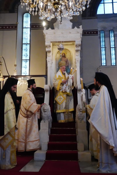 Στη Θεία Λειτουργία προεξήρχε ο επιχώριος Μητροπολίτης Γέρων Χαλκηδόνος κ. Εμμανουήλ, συμπαραστατούμενος από τους Θεοφιλ. Επισκόπους Αραβισσού κ. Κασσιανό και Τράλλεων κ. Βενιαμίν, στο τέλος της οποίας ο Σεβασμιώτατος απηύθυνε ομιλία προς το εκκλησίασμα υπογραμμίζοντας τη σημασία των αποφάσεων της Δ’ Οικουμενικής Συνόδου για την αποστολή και την ευθύνη του Οικουμενικού Θρόνου, με ιδιαίτερη έμφαση στον περίφημο 28ο Κανόνα.