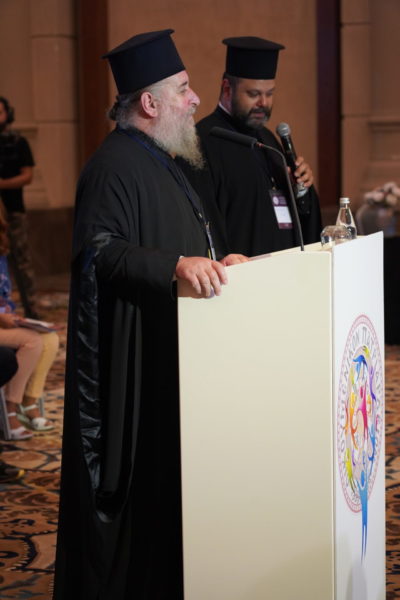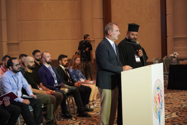 Προηγουμένως, τον Παναγιώτατο προσφώνησε ο Μητροπολίτης Ίμβρου και Τενέδου, ενώ χαιρετισμούς προς τους συνέδρους απηύθυναν ο κ. Ανδρέας Κατσανιώτης, Υφυπουργός Εξωτερικών της Ελλάδος, και ο κ. Roman Nedilskyi, Γενικός Πρόξενος της Ουκρανίας στην Πόλη.