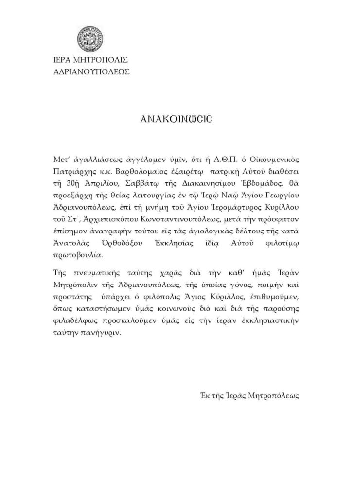 Αναλυτικά η ανακοίνωση της Μητρόπολης Αδριανουπόλεως: