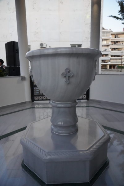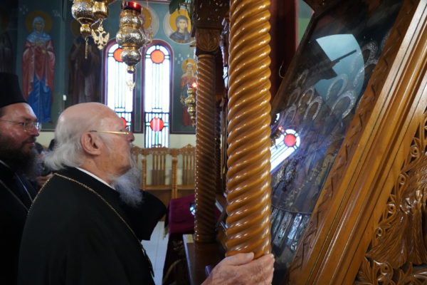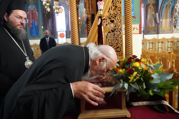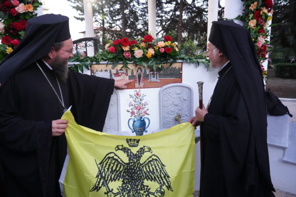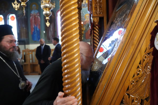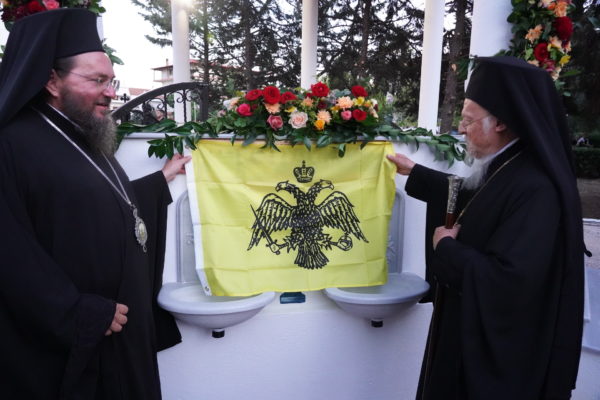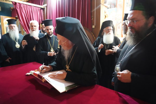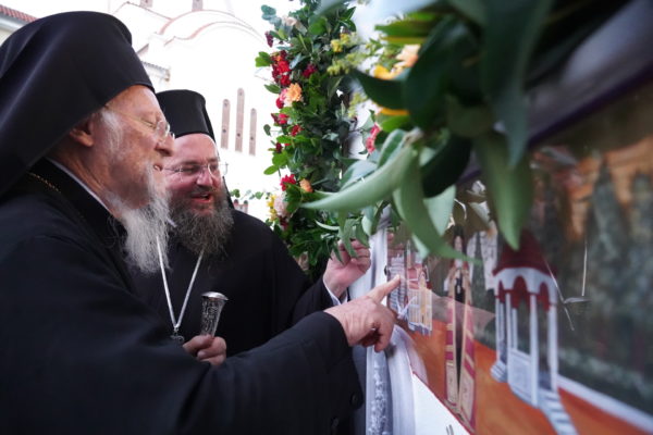 Εκεί ο Παναγιώτατος τέλεσε τον Αγιασμό καθιέρωσης της Φιάλης που βρίσκεται στον προαύλειο χώρο του Ιερού Ναού. Εκεί προσφώνησε τον Οικουμενικό Πατριάρχη ο προϊστάμενος του Ναού, πρωτ. π. Πολύκαρπος Κοντοζίδης.
