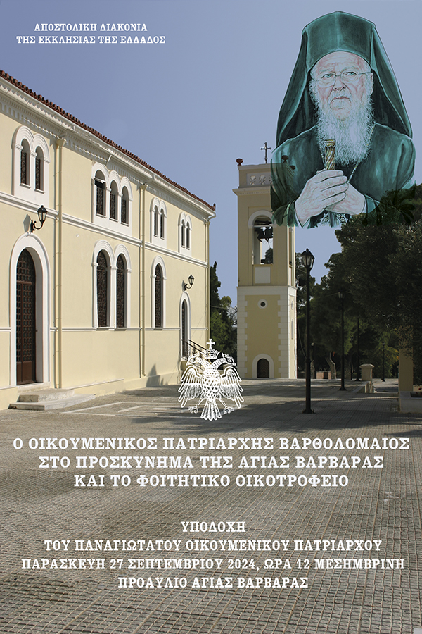 Ο Παναγιώτατος Οικουμενικός Πατριάρχης κ.κ. Βαρθολομαίος θα επισκεφθεί την Παρασκευή 27 Σεπτεμβρίου 2024, την πόλη της Αγίας Βαρβάρας στην Αττική και το Ιερό Προσκύνημα της Αγίας, όπου θα τον υποδεχθεί ο Πανιερώτατος Μητροπολίτης Φαναρίου κ. Αγαθάγγελος, Γενικός Διευθυντής της Αποστολικής Διακονίας της Εκκλησίας της Ελλάδος.