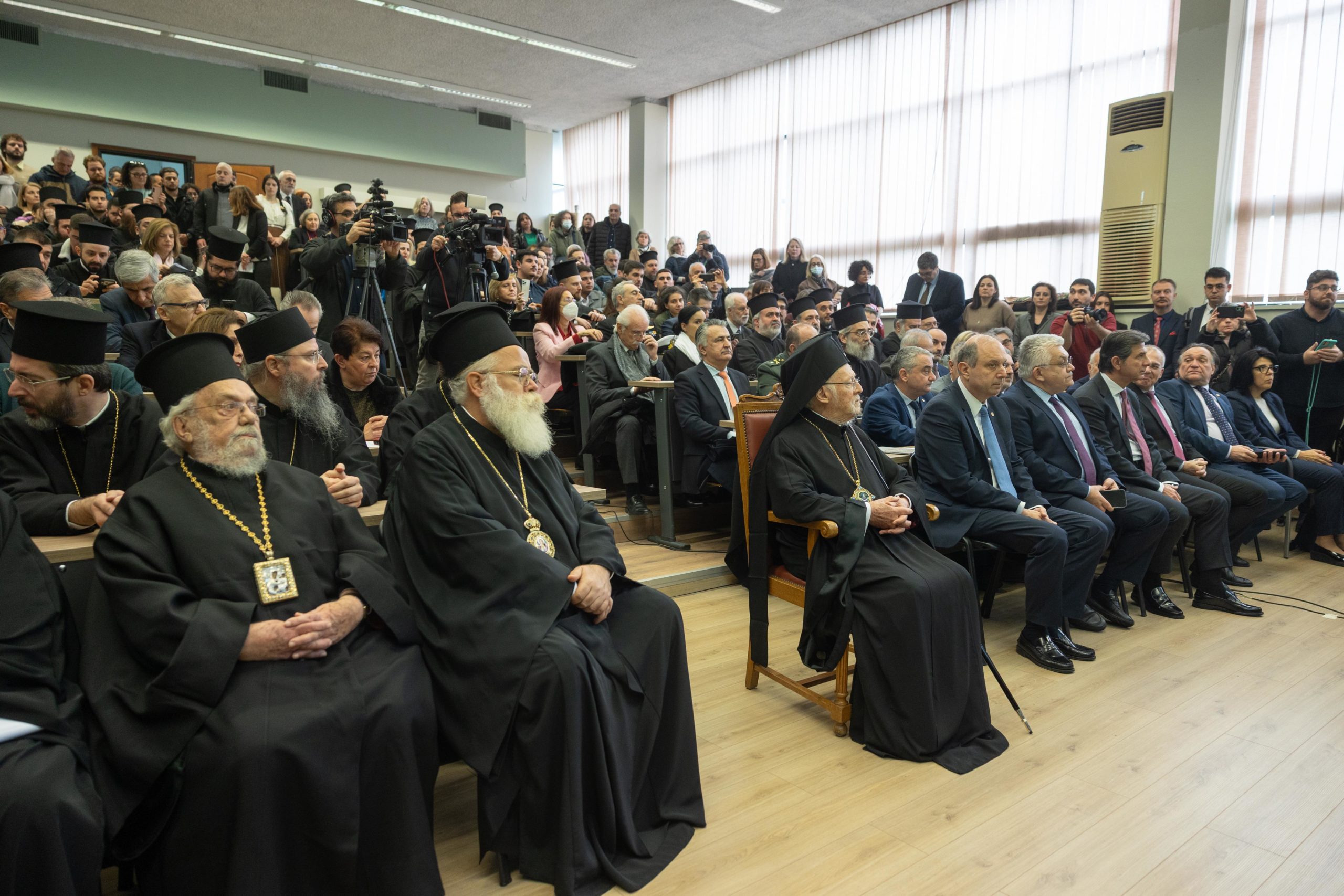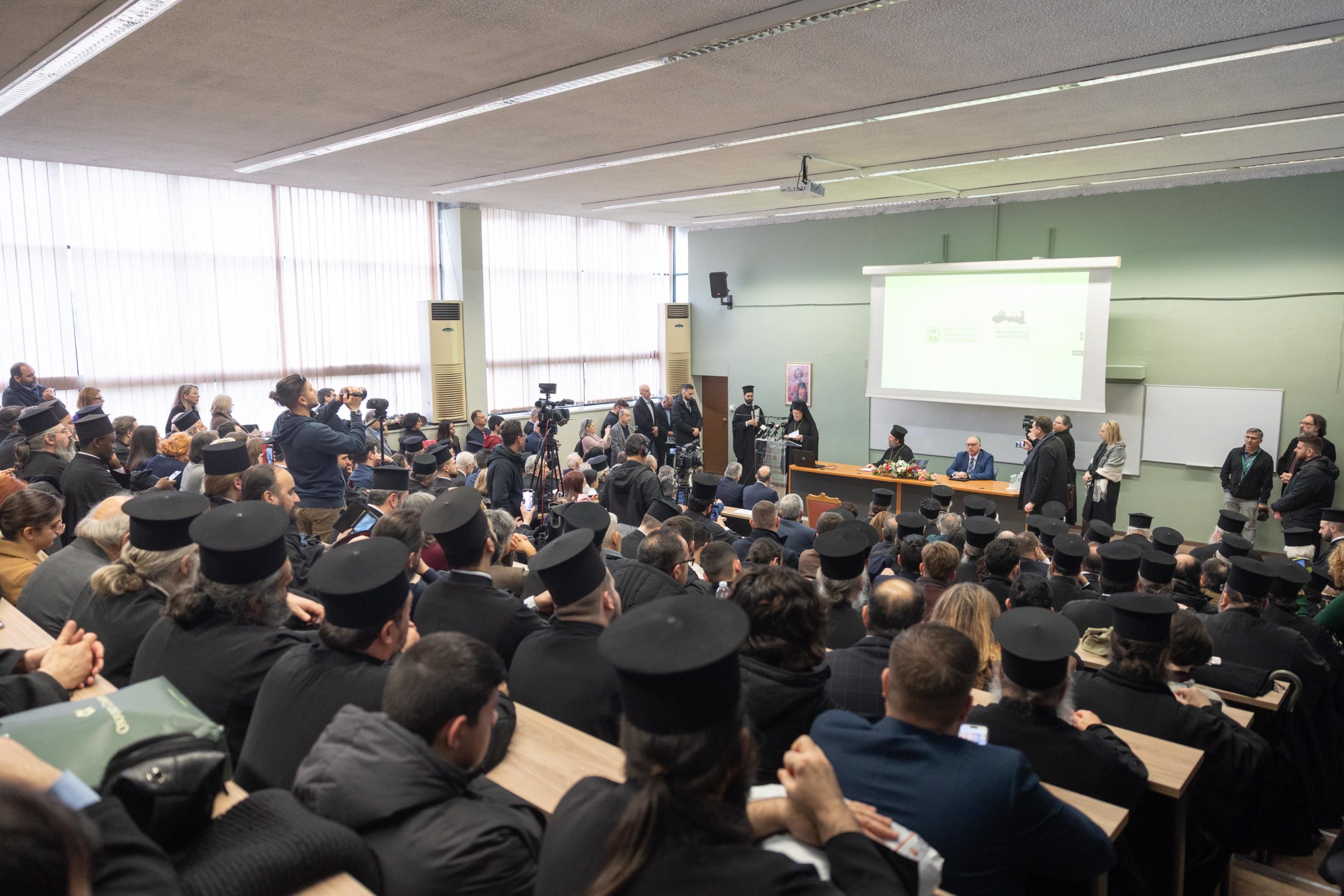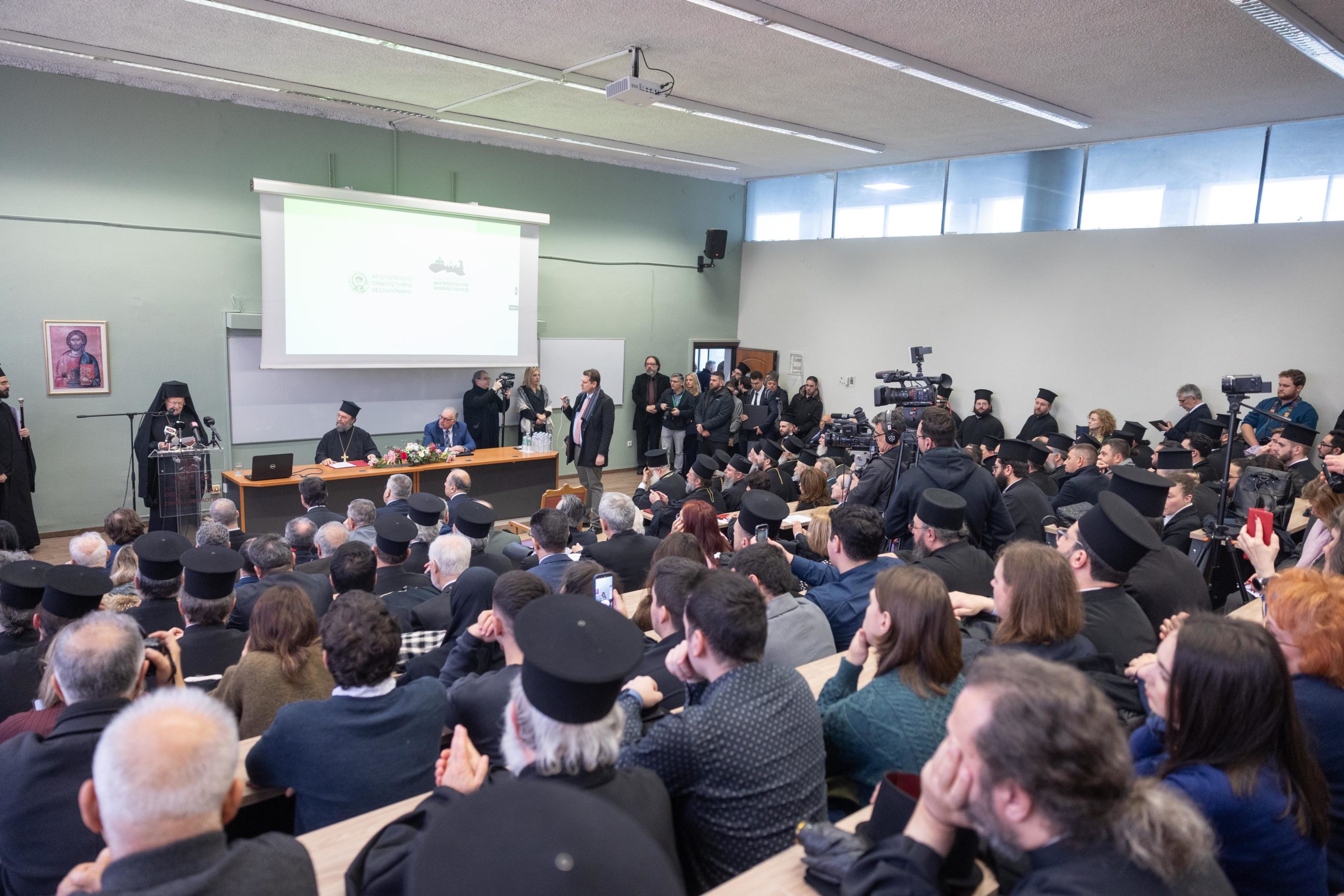 Νωρίτερα, στο Β’ Αμφιθέατρο της Θεολογικής Σχολής Α.Π.Θ. ο Οικουμενικός Πατριάρχης κ.κ. Βαρθολομαίος παρέστη στην τελετή ίδρυσης της επώνυμης Έδρας, με τίτλο: «Μητροπολίτης Δράμας Παύλος – Εκκλησιαστική Ιστορία και Πολιτισμός του Ελληνισμού της Ανατολής (11ος-20ός αιώνας)».
