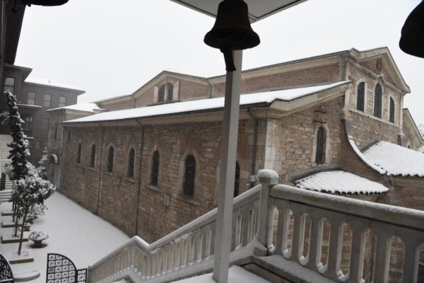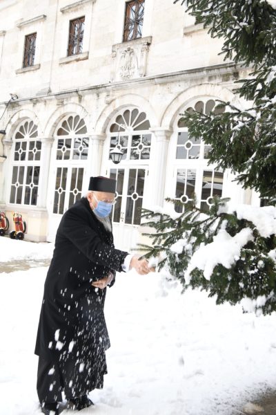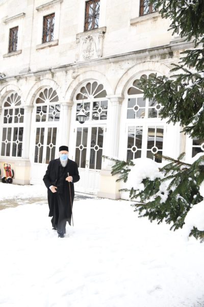 Χιονισμένο συνεχίζει να είναι το Φανάρι και ο Πάνσεπτος Πατριαρχικός Ναός του Αγίου Γεωργίου στην Κωνσταντινούπολη. Στα φωτογραφικά στιγμιότυπα, ο Παναγιώτατος Οικουμενικός Πατριάρχης κ.κ. Βαρθολομαίος, έξω στον περίβολο, σε μία μικρή βόλτα στο κατάλευκο τοπίο.