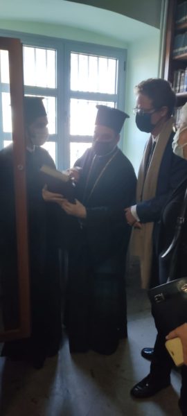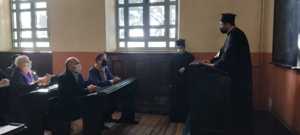 Οι υψηλοί επισκέπτες έγιναν δεκτοί από τον Καθηγούμενο, Θεοφιλέστατο Επίσκοπο Αραβισσού κ. Κασσιανό και την περί αυτόν αδελφότητα και ξεναγήθηκαν στο ναΰδριο, την αίθουσα τελετών, την βιβλιοθήκη και τους λοιπούς χώρους της Σχολής.