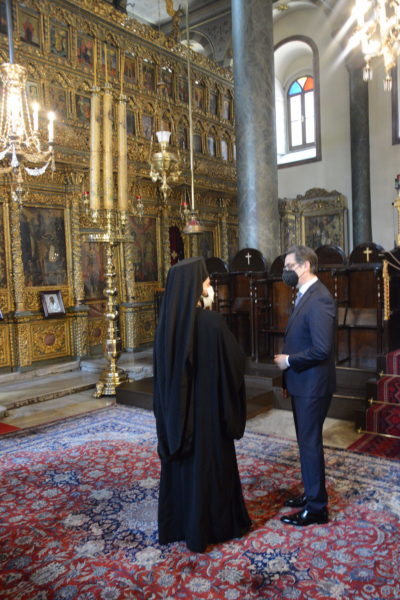 Ακολούθως, ο κ. Pendarovski και τα μέλη της Αντιπροσωπείας του, προσκύνησαν στον Πατριαρχικό Ναό, και στη συνέχεια έγιναν δεκτοί από τον Οικουμενικό Πατριάρχη κ.κ. Βαρθολομαίο, ο οποίος εξέφρασε τη χαρά του για την επίσκεψη του Εξοχ. κ. Προέδρου στην Έδρα της Πρωτοθρόνου Εκκλησίας της Ορθοδοξίας. Ο κ. Pendarovski ανέφερε στην απάντησή του ότι είχε βρεθεί και πάλι στο Οικουμενικό Πατριαρχείο, στις αρχές της δεκαετίας του 2000, συνοδεύοντας τον τότε Πρόεδρο της χώρας του, ως μέλος του επιτελείου του.