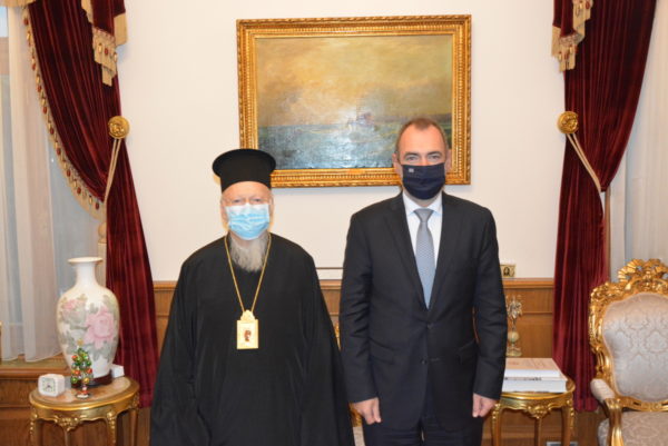 Η Α.Θ. Παναγιότης ο Οικουμενικός Πατριάρχης κ.κ. Βαρθολομαίος δέχθηκε χθες, Δευτέρα, 29 Νοεμβρίου 2021, τον Υφυπουργό Εξωτερικών της Ελλάδος κ. Ανδρέα Κατσανιώτη, εκπρόσωπο της Ελληνικής Κυβερνήσεως στην Θρονική εορτή του Οικουμενικού Πατριαρχείου, ο οποίος συνοδευόταν από τον κ. Ιωάννη Χρυσουλάκη, Ομότιμο Καθηγητή και Γενικό Γραμματέα Αποδήμου Ελληνισμού και Δημόσιας Διπλωματίας, την κ. Γεωργία Σουλτανοπούλου, Γενική Πρόξενο στην Πόλη, και τον κ. Χριστόδουλο Μαργαρίτη, Διευθυντή του Διπλωματικού Γραφείου του κ. Υφυπουργού.