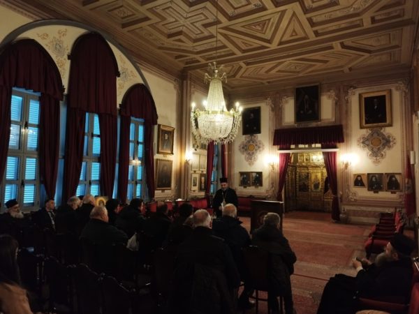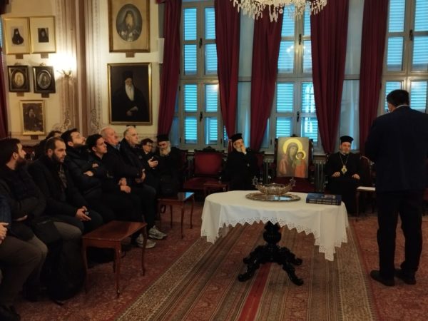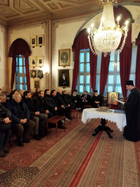 Οι επισκέπτες έγιναν δεκτοί από τον Καθηγούμενο, Θεοφιλέστατο Επίσκοπο Αραβισσού κ. Κασσιανό, και την περί αυτόν αδελφότητα στο Μέγα Συνοδικό της Σχολής. Υποδεχόμενος τους επισκέπτες ο Καθηγούμενος αναφέρθηκε στην ιστορία της Σχολής, ειδικότερα όμως στη συμβολή της στην Πατριαρχική Μουσική παράδοση, μέσω των μεγάλων Μουσικοδιδασκάλων που δίδαξαν σε αυτήν. Εκ μέρους των Ιεροψαλτών, τον Καθηγούμενο προσφώνησε ο Πρόεδρος του Συλλόγου, Αθανάσιος Δημητρίου.