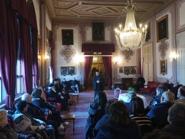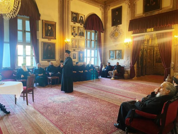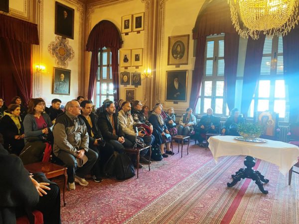 Τους Αρχιερείς και τους προσκυνητές υποδέχθηκε στο Μέγα Συνοδικό της Σχολής ο Καθηγούμενος, Θεοφιλέστατος Επίσκοπος Αραβισσού κ. Κασσιανός, ο οποίος τους καλωσόρισε στο ιστορικό πνευματικό καθίδρυμα του Οικουμενικού Πατριαρχείου, αναφερόμενος στην μακρά ιστορία του και στην προσφορά του στην Εκκλησία και το Γένος.