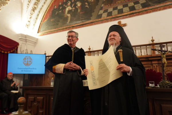 Ο Επίσκοπος Ciudad Rodrigo και Salamanca, José Luis Retana, προήδρευσε της Τελετής, παρουσία του Πρύτανη Οσιολ. Santiago García-Jalón, του Ακαδημαϊκού Συμβουλίου, των καθηγητών και του διδακτικού προσωπικού, ενώ για την προσωπικότητα, το έργο και τη διακονία του Πατριάρχου μίλησε ο Καθηγητής της Θεολογικής Σχολής Fernando Rodriguez Garrapucho. Το Ψήφισμα της Συγκλήτου ανέγνωσε ο Πρύτανης, ο οποίος και επέδωσε τον σχετικό πάπυρο και τα διάσημα στον Παναγιώτατο.