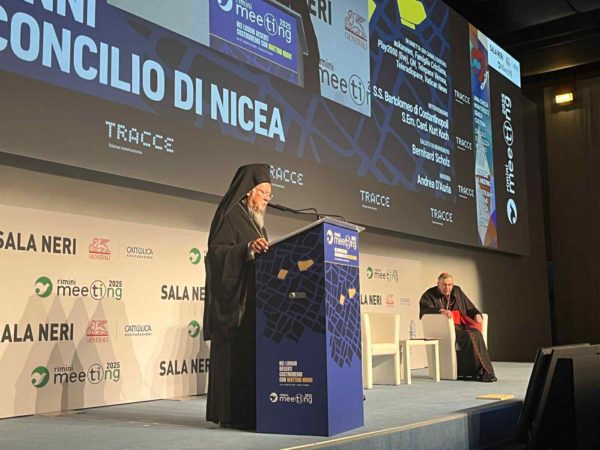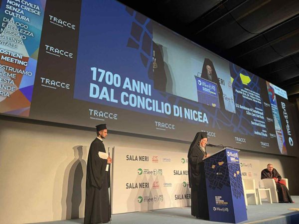 Στη συνέχεια πραγματοποίησε εκτενή ομιλία στα ιταλικά με θέμα «1700 χρόνια από τη Σύνοδο της Νίκαιας», την οποία παρακολούθησε με μεγάλο ενδιαφέρον το πολυπληθές κοινό, χειροκροτώντας θερμά τον ομιλητή. Τον Οικουμενικό Πατριάρχη παρουσίασαν και καλωσόρισαν ο κ. Andrea D’Auria, Διευθυντής του Διεθνούς Κέντρου «Communion and Liberation», και ο κ. Bernhard Scholz, Πρόεδρος του «Rimini Meeting».