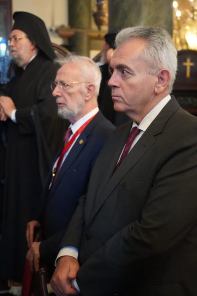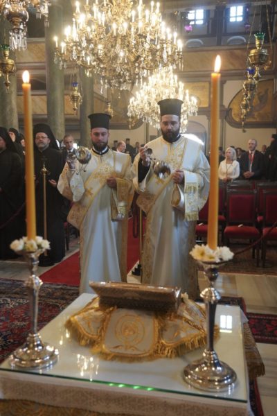 Εκκλησιάστηκαν οι Σεβ. Αρχιεπίσκοπος Ανθηδώνος κ. Νεκτάριος, Επίτροπος του Παναγίου Τάφου στην Πόλη, και Μητροπολίτης Ταλλίνης και πάσης Εσθονίας κ. Στέφανος, οι Θεοφιλ. Επίσκοποι Αλικαρνασσού κ. Αδριανός, Αραβισσού κ. Κασσιανός, Ευδοκιάδος κ. Αμβρόσιος, Τράλλεων κ. Βενιαμίν, Δαφνουσίας κ. Σμάραγδος και Ξανθουπόλεως κ. Παΐσιος, μοναχοί και μοναχές, Άρχοντες Οφφικιάλιοι της Μ.τ.Χ.Ε., ο Εξοχ. Πρέσβυς κ. Κωνσταντίνος Κούτρας, Γενικός Πρόξενος της Ελλάδος στην Πόλη, ο Εντιμ. κ. Roman Nedilskyi, Γενικός Πρόξενος της Ουκρανίας, μαθητές και μαθήτριες των Ομογενειακών σχολείων της Πόλεως και της Ίμβρου, μαζί με καθηγητές τους, και πλήθος πιστών.