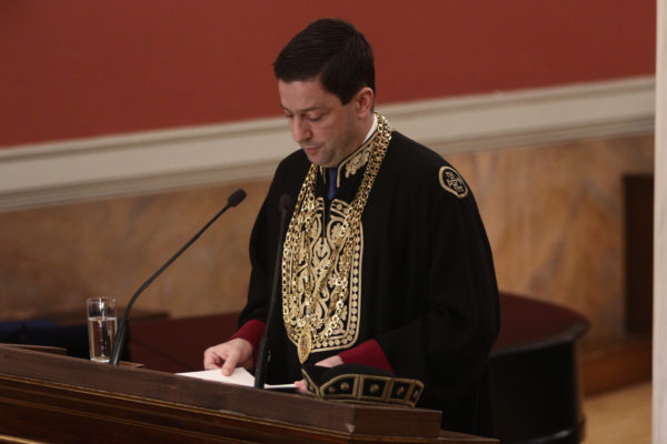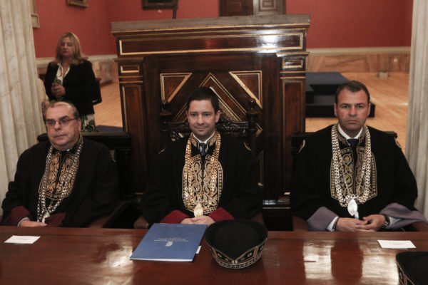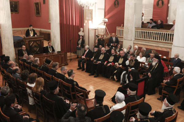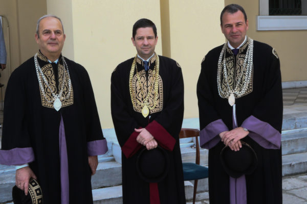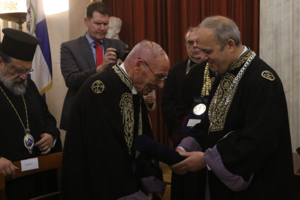 Στην συνέχεια ο Κοσμήτορας της Θεολογικής Σχολής, καθηγητής Εμμανουήλ Καραγεωργούδης ανέγνωσε το Ψήφιοσμα και επέδωσε την περγαμηνή.