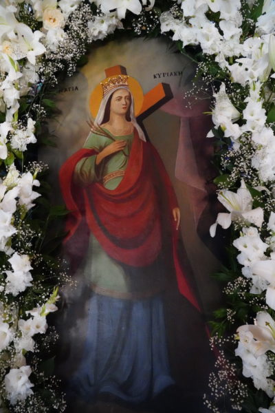 “Έτερος τομέας δράσης των γυναικών αυτών ήταν οι επισκέψεις στους ασθενείς, στους θλιβομένους, στους ενδεείς. Είναι αναρίθμητες εκείνες οι γυναίκες οι οποίες μαρτύρησαν στον βωμό της αγάπης, της θυσίας, της προσφοράς. Μία από αυτές είναι και η Αγία Κυριακή. Η χριστιανική ανατροφή και η συνείδησή της δεν της επέτρεπαν να ζει μόνο για τον εαυτό της. Αφιέρωσε ολόκληρη τη ζωής στη διακονία των άλλων των κατά πίστη αδελφών, μέχρι του μαρτυρίου”, τόνισε ο Παναγιώτατος.