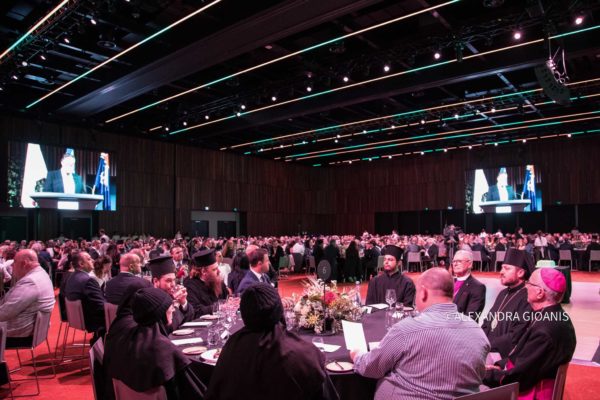 Το επίσημο Δείπνο προς τιμήν του Οικουμενικού Πατριάρχου φιλοξενήθηκε στην κατάμεστη από περίπου 1.500 ομογενείς αίθουσα Centrepiece, στο MelbournePark. Παρεκάθησαν, μεταξύ άλλων, τα μέλη της Πατριαρχικής Συνοδείας, την οποία αποτελούν οι Σεβασμιώτατοι Μητροπολίτες Ίμβρου και Τενέδου κ. Κύριλλος και Θεσσαλονίκης κ. Φιλόθεος, οι Πανοσιολ. Μέγας Πρωτοσύγκελλος κ. Γρηγόριος, και Μέγας Εκκλησιάρχης κ. Αέτιος, Διευθυντής του Ιδιαιτέρου Πατριαρχικού Γραφείου, ο Ιερολ. Πατριαρχικός Διάκονος κ. Ευλόγιος, Κωδικογραφεύων της Αγίας και Ιεράς Συνόδου, η Οσιωτ. Μοναχή Ιακώβη, Ηγουμένη του Ιερού Ησυχαστηρίου του Τιμίου Προδρόμου Ακριτοχωρίου, οι Εντιμολ. Άρχων Διδάσκαλος του Γένους κ. Κωνσταντίνος Δεληκωσταντής, Διευθυντής του Α’ Πατριαρχικού Γραφείου, και Άρχων Διδάσκαλος της Εκκλησίας κ. Θεόδωρος Γιάγκου, Καθηγητής της Θεολογικής Σχολής του Αριστοτελείου Πανεπιστημίου Θεσσαλονίκης, οι Εντιμ. κ. Νικόλαος – Γεώργιος Παπαχρήστου, Διευθυντής του Πατριαρχικού Γραφείου Τύπου και Επικοινωνίας, κ. Θεμιστοκλής Καρανικόλας, εκ του προσωπικού του Πατριαρχείου, καθώς επίσης οι Σεβασμιώτατοι Μητροπολίτες Δέρβης κ. Ιεζεκιήλ και Σεβαστείας κ. Σεραφείμ, οι Θεοφιλέστατοι Επίσκοποι της Ιεράς Αρχιεπισκοπής Αυστραλίας, ο Πρέσβης της Ελλάδος στην Αυστραλία κ. Σταύρος Βενιζέλος, ο Ύπατος Αρμοστής της Κυπριακής Δημοκρατίας κ. Αντώνιος Σαμμούτης, οι Γενικοί Πρόξενοι της Ελλάδος στη Μελβούρνη κ. Εμμανουήλ Κακαβελάκης και στην Αδελαΐδα κ. Αλεξάνδρα Θεοδωροπούλου, η Ομοσπονδιακή Βουλευτής κ. Μαρία Βαμβακινού, ο κ. John Pesutto, Αρχηγός της Αντιπολιτεύσεως στην Πολιτεία της Βικτώριας, ο κ. Jeff Kennett, πρώην Πρωθυπουργός της Βικτώριας, Άρχοντες της Μ.τ.Χ.Ε., ο κατά σάρκα αδελφός του Οικουμενικού Πατριάρχου κ. Νικόλαος Αρχοντώνης και οι γονείς του Αρχιεπισκόπου Αυστραλίας, Εμμανουήλ και Φωτεινή Γρινιεζάκη. Το Δείπνο διανθίστηκε από μουσικό πρόγραμμα, ενώ στην κορύφωση της βραδιάς ο Παναγιώτατος, από κοινού με τον Σεβασμιώτατο κ. Μακάριο, έκοψαν εόρτια τούρτα για τα εκατό χρόνια της Ιεράς Αρχιεπισκοπής Αυστραλίας.