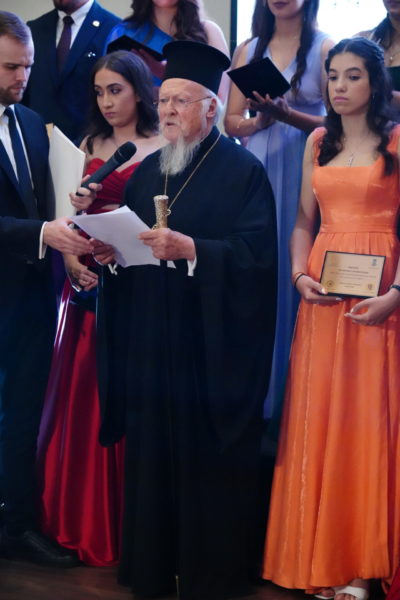 Ο Οικουμενικός Πατριάρχης, παρουσία της Γενικής Πρόξενου της Ελλάδος στην Πόλη κ. Γεωργίας Σουλτανοπούλου, του Συντονιστού Εκπαιδεύσεως του Γεν. Προξενείου κ. Ιωάννη Γιγουρτσή, των Διευθυντών και Καθηγητών των ομογενειακών σχολείων και των οικογενειών των αποφοίτων, απηύθυνε προς τις νέες και τους νέους της Ρωμιοσύνης συγχαρητήριες ευχές για την ολοκλήρωση της 12ετούς βασικής εκπαιδεύσεώς τους, και υπογράμμισε ότι οι καθηγητές και οι καθηγήτριές τους, στην Πατριαρχική Μεγάλη του Γένους Σχολή, στο Ζωγράφειο, στο Ζάππειο και στο Λύκειο της Ίμβρου, αγωνίστηκαν για να τους δώσουν όλα τα απαραίτητα εφόδια ώστε να είναι κατηρτισμένοι καλά και με σμιλευμένο χαρακτήρα.