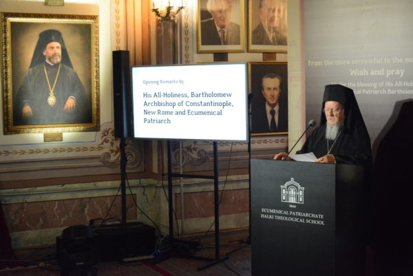 Ολοκληρώνοντας την ομιλία του ο Παναγιώτατος χαιρέτησε την διοργάνωση του διεθνούς επιστημονικού Συμποσίου, με την ευκαιρία της πανηγύρεως του Ιερού Φωτίου, και επαίνεσε την οργανωτική επιτροπή του για την επιλογή της θεματικής του, "διά της οποίας αναδεικνύεται η ταυτότης της Θεολογικής μας Σχολής, αι προοπτικαί διά το μέλλον της, το «πνεύμα της Χάλκης» ομού μετά των πολλών οικολογιών, διαχριστιανικών, διαθρησκειακών, ειρηνευτικών δράσεων του Οικουμενικού Πατριαρχείου και των πρωτοβουλιών του εις το πεδίον της προστασίας των δικαιωμάτων του ανθρώπου και της θρησκευτικής ελευθερίας". Συνεχάρη δε, ιδιαιτέρως, τον Θεοφιλ. Επίσκοπο Αραβισσού κ. Κασσιανό, Ηγούμενο της Μονής, τον Εντιμολ. Άρχοντα της Μ.τ.Χ.Ε. κ. Συμεών Πασχαλίδη, Καθηγητή του Αριστοτελείου Πανεπιστημίου Θεσσαλονίκης και Διευθυντή του Πατριαρχικού Ιδρύματος Πατερικών Μελετών, καθώς και τους συμμετέχοντες και όλους όσοι συνέβαλαν για την προετοιμασία και πραγματοποίηση του Συνεδρίου.