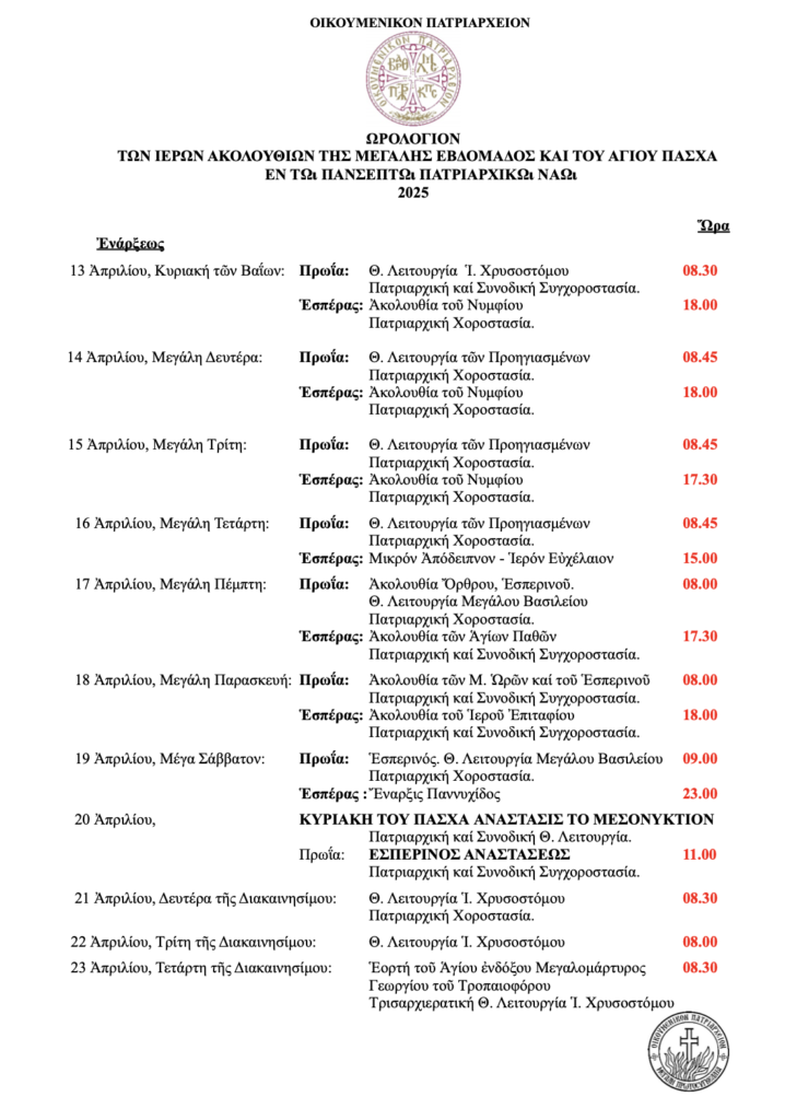 Δείτε το Ωρολόγιον των Ιερών Ακολουθιών της Μεγάλης Εβδομάδος και του Αγίου Πάσχα στον Πάνσεπτο Πατριαρχικό Ναό, όπως αυτό ανακοινώθηκε από την Μ. Πρωτοσυγκελλία: