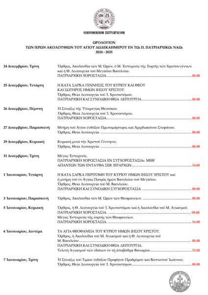 Δείτε το Ωρολόγιον των Ιερών Ακολουθιών του Αγίου Δωδεκαημέρου στον Πάνσεπτο Πατριαρχικό Ναό, όπως αυτό ανακοινώθηκε από την Μ. Πρωτοσυγκελλία: