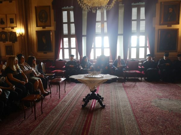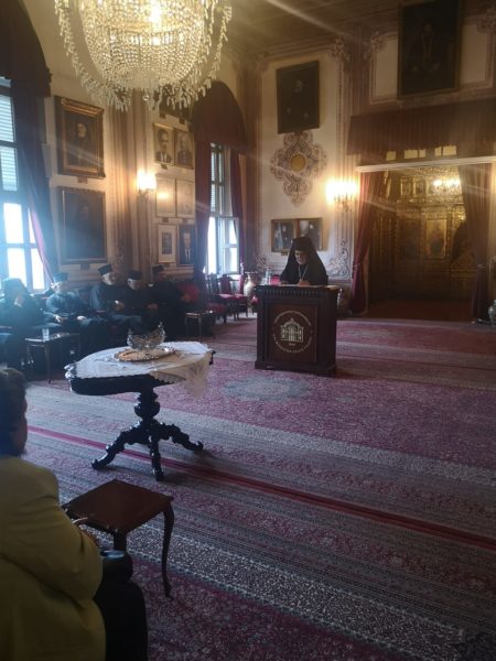 Ακολούθησε δεξίωση στο Μέγα Συνοδικό της Σχολής, κατά την οποία τους Σεβασμιωτάτους Αρχιερείς και τους εκκλησιασθέντες πιστούς προσεφώνησε ο Καθηγούμενος, αναφερόμενος τόσο στη σημερινή εορτή και το κατ’ έτος προσκύνημα των μελών της Εστίας Θεολογων Χάλκης, όσον και στο ζήτημα της επαναλειτουργίας της Σχολής.