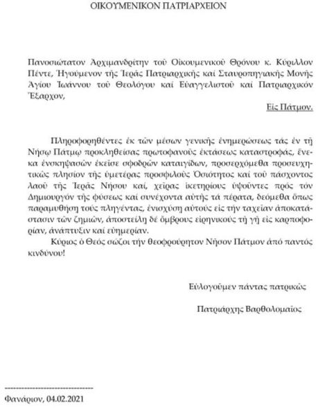 Τηλεγράφημα συμπαραστάσεως απέστειλε ο Παναγιώτατος Οικουμενικός Πατριάρχης κ.κ. Βαρθολομαίος προς τον Καθηγούμενο και Πατριαρχικό Έξαρχο Πάτμου και τον Πατμιακό Λαό επ’ αφορμή των πρωτοφανούς εκτάσεως καταστροφών που ενέσκηψαν στον ευλογημένη νήσο απο τα σφοδρά καιρικά φαινόμενα. Ο Παναγιώτατος αναφέρει παρηγορητικά ότι το Οικουμενικό Πατριαρχείο εύχεται και προσεύχεται με θέρμη για την πνευματική ενίσχυση των πληγέντων της Ιεράς Νήσου και την υλική αποκατάσταση των ζημιών