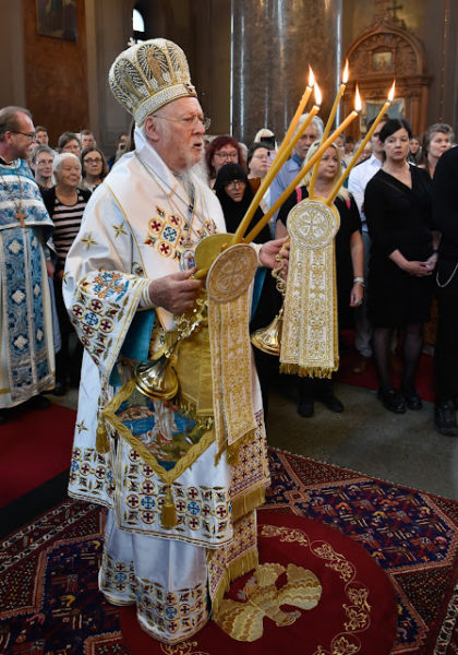 Κατά την άφιξή του στον Καθεδρικό Ναό τον Οικουμενικό Πατριάρχη υποδέχθηκε πλήθος πιστών με τα μικρά παιδιά να του προσφέρουν λουλούδια.