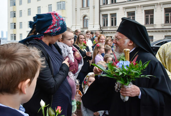 Κατά την άφιξή του στον Καθεδρικό Ναό τον Οικουμενικό Πατριάρχη υποδέχθηκε πλήθος πιστών με τα μικρά παιδιά να του προσφέρουν λουλούδια.