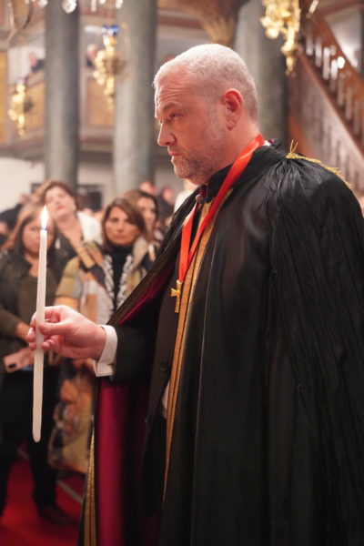 Στο τέλος του Εσπερινού ο Παναγιώτατος απένειμε το Οφφίκο του Άρχοντος Οστιαρίου της Αγίας του Χριστού Μεγάλης Εκκλησίας στον Εντιμολ. κ. Λεωνίδα Τζώνη, Οικονομολόγο.