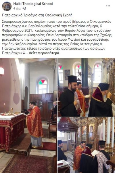 Συμπροσευχόμενος παρέστη από του ιερού βήματος ο Οικουμενικός Πατριάρχης κ.κ. Βαρθολομαίος κατά την τελεσθείσα στις 6 Φεβρουαρίου 2021, κεκλεισμένων των θυρών λόγω των ισχυόντων περιορισμών κυκλοφορίας, Θεία Λειτουργία στο ναΰδριο της Σχολής, μετατεθείσης της πανηγύρεως του Ιερού Φωτίου και εορτασθείσης την 5ην Φεβρουαρίου. Μετά το πέρας της Θείας Λειτουργίας ο Παναγιώτατος τέλεσε τρισάγιο υπέρ αναπαύσεως των αοιδίμων Πατριάρχου Φωτίου Β΄ και Μητροπολίτου Ηρακλείας Φωτίου, του από Ίμβρου και Τενέδου.