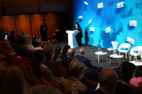 Προηγουμένως, τον Οικουμενικό Πατριάρχη καλωσόρισε με θερμούς λόγους η Πρόεδρος του ιδρύματος, Ευγεν. κ. Εύη Λαζού-Λασκαρίδη.