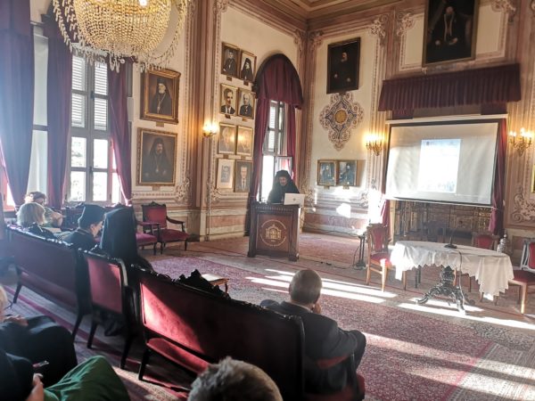 Χαιρετισμό απηύθηναν επίσης ο Καθηγούμενος, Θεοφιλέστατος Επίσκοπος Αραβισσού κ. Κασσιανός, ο οποίος αναφέρθηκε στην κατ’ έτος διοργάνωση ενός συνεδρίου σε συνεργασία με το ΕΚΒΜΜ και στην αρωγή του ιδρύματος προς την Σχολή, αλλά και η Πρόεδρος του Κέντρου, Καθηγήτρια κ. Ναταλία Πούλου, η οποία μάλιστα επέδωσε επισήμως τον εκδοθέντα τόμο των Πρακτικών του κατά το παρελθόν έτος γενομένου συνεδρίου.