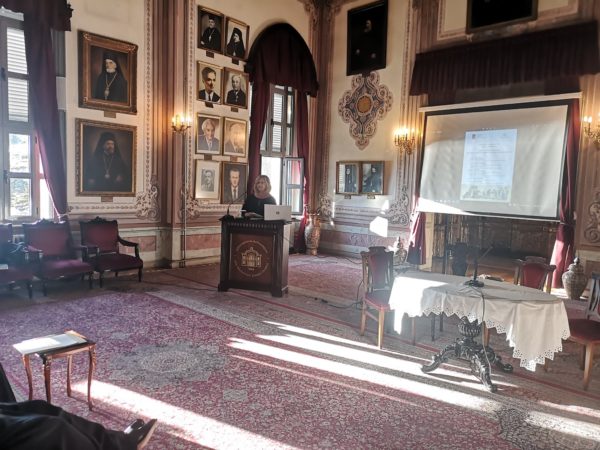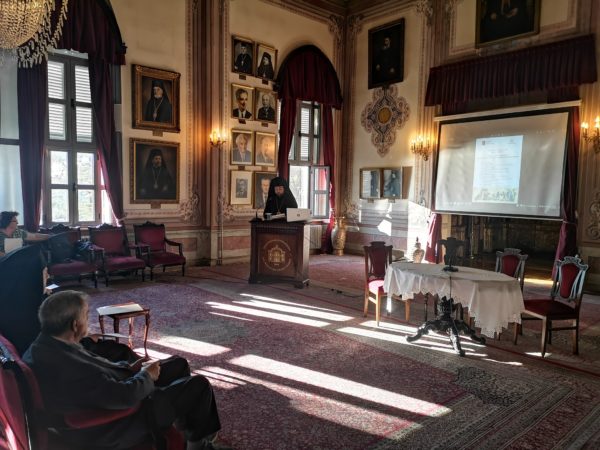 Χαιρετισμό απηύθηναν επίσης ο Καθηγούμενος, Θεοφιλέστατος Επίσκοπος Αραβισσού κ. Κασσιανός, ο οποίος αναφέρθηκε στην κατ’ έτος διοργάνωση ενός συνεδρίου σε συνεργασία με το ΕΚΒΜΜ και στην αρωγή του ιδρύματος προς την Σχολή, αλλά και η Πρόεδρος του Κέντρου, Καθηγήτρια κ. Ναταλία Πούλου, η οποία μάλιστα επέδωσε επισήμως τον εκδοθέντα τόμο των Πρακτικών του κατά το παρελθόν έτος γενομένου συνεδρίου.