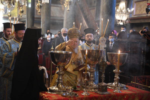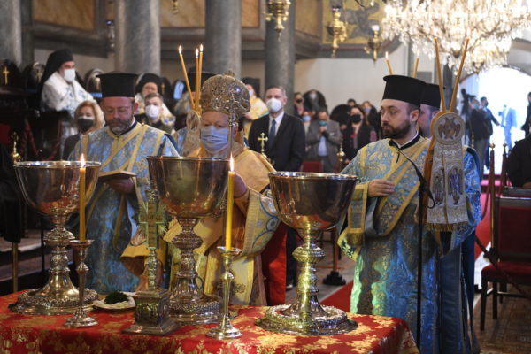 Ο Παναγιώτατος, μετά τον Όρθρο, κατά τον οποίο χοροστάτησε, τέλεσε τον Μεγάλο Αγιασμό, και στη συνέχεια προέστη της Θείας Λειτουργίας, συλλειτουργούντων των Σεβ. Αρχιερέων Φιλαδελφείας κ. Μελίτωνος, Ανθηδώνος κ. Νεκταρίου, Επιτρόπου του Παναγίου Τάφου στην Πόλη, Μύρων κ. Χρυσοστόμου,Καλλιουπόλεως και Μαδύτου κ. Στεφάνου, και Κυδωνιών κ. Αθηναγόρα.