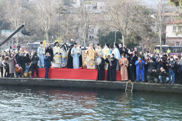 Μετά το τέλος της Θείας Λειτουργίας ο Οικουμενικός Πατριάρχης, οι Αρχιερείς, οι επίσημοι και ο πιστός λαός εν πομπή μετέβησαν στην προκυμαία του Φαναρίου όπου ο Παναγιώτατος προεξήρχε της τελετής του Αγιασμού των υδάτων και της καταδύσεως του Τιμίου Σταυρού στον Κεράτιο Κόλπο.