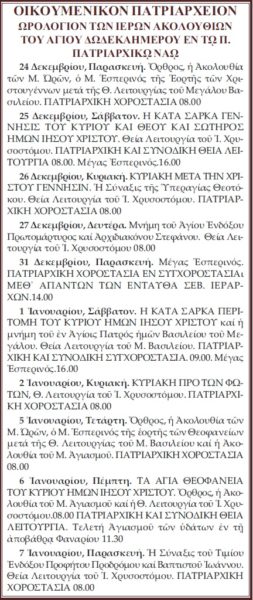 Πρόγραμμα Ακολουθιών Αγίου Δωδεκαημέρου στο Φανάρι