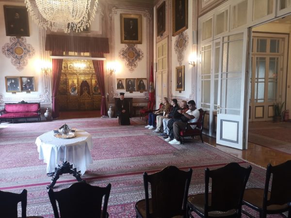 Τους επισκέπτες υποδέχθηκε ο Καθηγούμενος, Θεοφιλέστατος Επίσκοπος Αραβισσού κ. Κασσιανός, μετά της περί αυτόν αδελφότητος. Κατά την προσφώνησή του προς τους επισκέπτες στο Μέγα Συνοδικό της Σχολής ο Καθηγούμενος αναφέρθηκε τόσο στην ιστορία της Θεολογικής Σχολής της Χάλκης, όσο και στην τριετή φοίτησή του στην Πατμιάδα Εκκλησιαστική Σχολή, επί Σχολαρχίας του Χαλκίτου Ματθαίου Μελιανού, στον όμοιο τρόπο οργάνωσης και λειτουργίας των δύο Σχολών και στα θετικά του εσωτερικού τρόπου ζωής, ενώ απηύθυνε πατρικές συμβουλές στους νεαρούς σπουδαστές για το μέλλον τους.