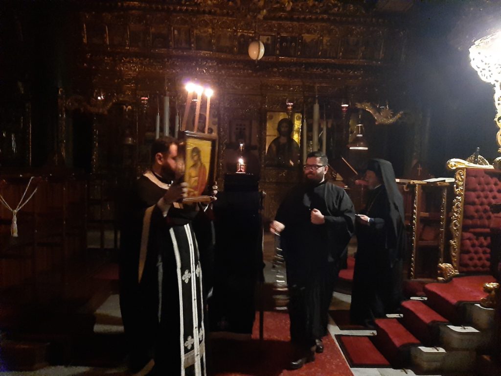 Με ιεροπρέπεια και κατάνυξη τελέστηκε “εν τω μέσω της νυκτός” κατά το εσπέρας της Κυριακής των Βαΐων (25/4/2021) η Ακολουθία του Νυμφίου, ήτοι του Όρθρου της Αγίας και Μεγάλης Δευτέρας Δευτέρας, με τον οποίο ξεκινά η εβδομάδα των Παθών του Κυρίου, χοροστατούντος από του Παραθρονίου του Καθηγουμένου, Θεοφιλεστάτου Επισκόπου Αραβισσού κ. Κασσιανού.
