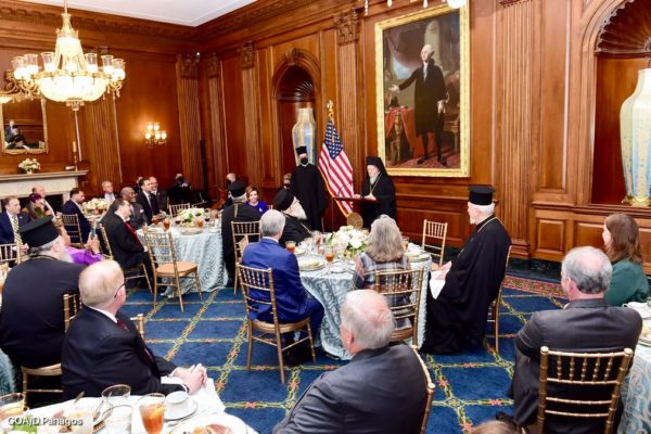 Στην ομιλία του κατά τη διάρκεια του μεσημεριανού γεύματος που παρατέθηκε προς τιμήν του, ο Παναγιώτατος εξέφρασε τη χαρά του του που βρίσκεται και πάλι ενώπιον Γερουσιαστών ενθυμούμενος την ημέρα που το Κογκρέσο του είχε απονείμει την υψηλότερη διάκρισή του. Υπενθυμίζεται, ότι ο Πατριάρχης κ.κ. Βαρθολομαίος έχει λάβει το 1997 το Χρυσό Μετάλλιο της Τιμής, το οποίο είναι η υψηλότερη διάκριση που απονέμει το Κογκρέσο των ΗΠΑ.