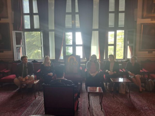 Κατόπιν, οι επισκέπτες ξεναγήθηκαν στο Μέγα Συνοδικό, τις αίθουσες διδασκαλίας, την ιστορική Βιβλιοθήκη και τους λοιπούς χώρους της Σχολής, προπεμπόμενοι από τον Καθηγούμενο.