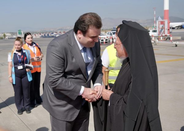 Ο Υπουργός Παιδείας, Θρησκευμάτων και Αθλητισμού Κυριάκος Πιερρακάκης υποδέχθηκε τον Παναγιώτατο στο αεροδρόμιο «Ελευθέριος Βενιζέλος» εκπροσωπώντας την Ελληνική Κυβέρνηση, παρουσία αγήματος της Πολεμικής Αεροπορίας.
