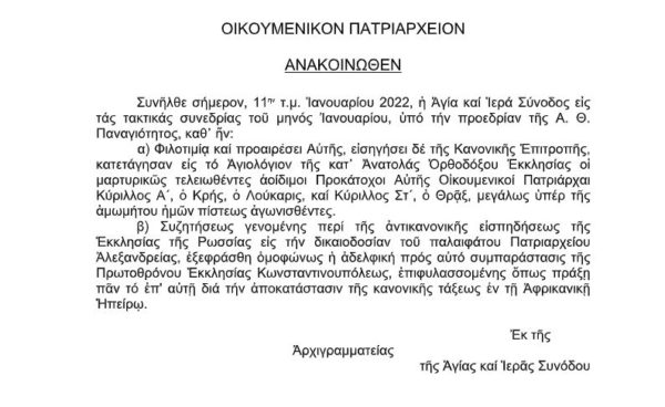 Συμπαράσταση προς το Πατριαρχείο Αλεξανδρείας αναφορικά με το φλέγον ζήτημα της εισπηδήσεως της Εκκλησίας της Ρωσίας σε περιοχές της δικαιοδοσίας του, εξέφρασε η Ιερά Σύνοδος του Οικουμενικού Πατριαρχείου με ανακοίνωση που εξέδωσε μετά το πέρας των τακτικών εργασιών της που πραγματοποιήθηκαν την Τρίτη 11 Ιανουαρίου 2022.