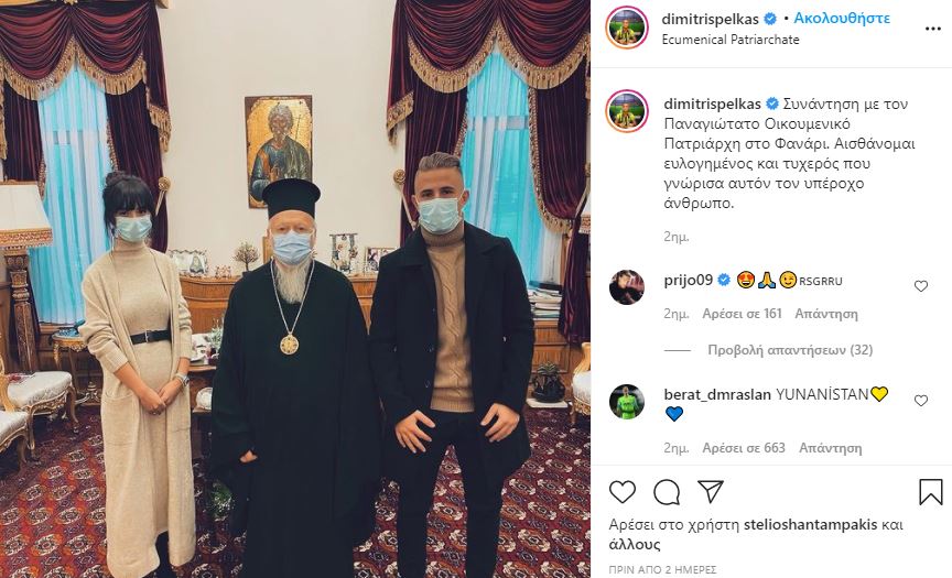 Δεκτός από την Α.Θ.Π. τον Οικουμενικό Πατριάρχη κ.κ. Βαρθολομαίο έγινε ο Έλληνας διεθνής ποδοσφαιριστής Δημήτρης Πέλκας, ο οποίος πήρε πρόσφατα μετεγγραφή για την τουρκική Φενέρμπαχτσε από τον ΠΑΟΚ. Μαζί με την σύζυγό του κ. Κυβέλη Μάρδα έλαβαν την ευχή του Παναγιωτάτου για την διαμονή τους στην Πόλη.