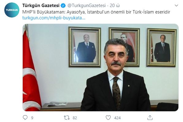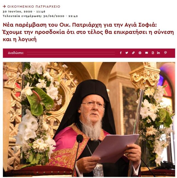 “Επειδή ο Βαρθολομαίος δεν μπορεί να πει “η Αγία Σοφία να μετατραπεί σε εκκλησία”, λέει ότι “η Αγία Σοφία ήταν στην υπηρεσία των Χριστιανών για 900 χρόνια και των Μουσουλμάνων για 500 χρόνια”, άρα πρέπει να διατηρήσει το καθεστώς του μουσείου, πέρα από ένα μαθηματικό σφάλμα, προβαίνει και σε ένα σημαντικό λάθος λογικής. Η Αγία Σοφία έχει ήδη… τουρκοποιηθεί με τη σφραγίδα του Σουλτάνου του Πορθητή το 1453 και είναι ένα σημαντικό τουρκο-ισλαμικό έργο της Κωνσταντινούπολης που θα ανήκει πάντοτε στην τουρκική πατρίδα”.