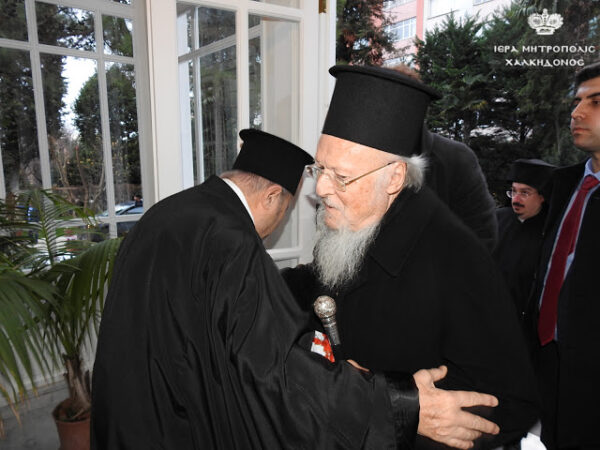 Το εσπέρας της ιδίας ημέρας ο Οικουμενικός Πατριάρχης κ.κ. Βαρθολομαίος, συνοδευόμενος από τον Υπογραμματέα της Ιεράς Συνόδου του Οικουμενικού Πατριαρχείου Πανοσ. Διάκονο κ. Γρηγόριο, τίμησε δια της υψηλής παρουσίας του, τον Γέροντα Χαλκηδόνος στο Μητροπολιτικό Μέγαρο.