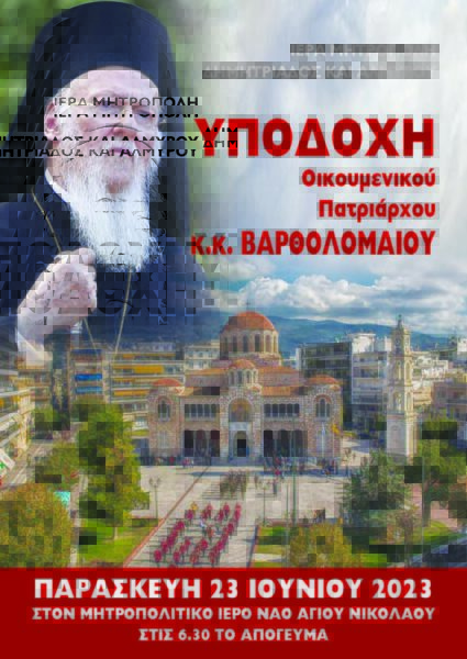 Η επίσημη υποδοχή του Παναγιωτάτου θα πραγματοποιηθεί σήμερα Παρασκευή 23 Ιουνίου, στις 6.30μ.μ., στην πλατεία του Μητροπολιτικού Ιερού Ναού Αγίου Νικολάου Βόλου. Θα ακολουθήσει η Επίσημη Δοξολογία, κατά την οποία τον κ. Βαρθολομαίο θα προσφωνήσει ο Μητροπολίτης κ. Ιγνάτιος. Θα ακολουθήσει η αντιφώνηση του Παναγιωτάτου.